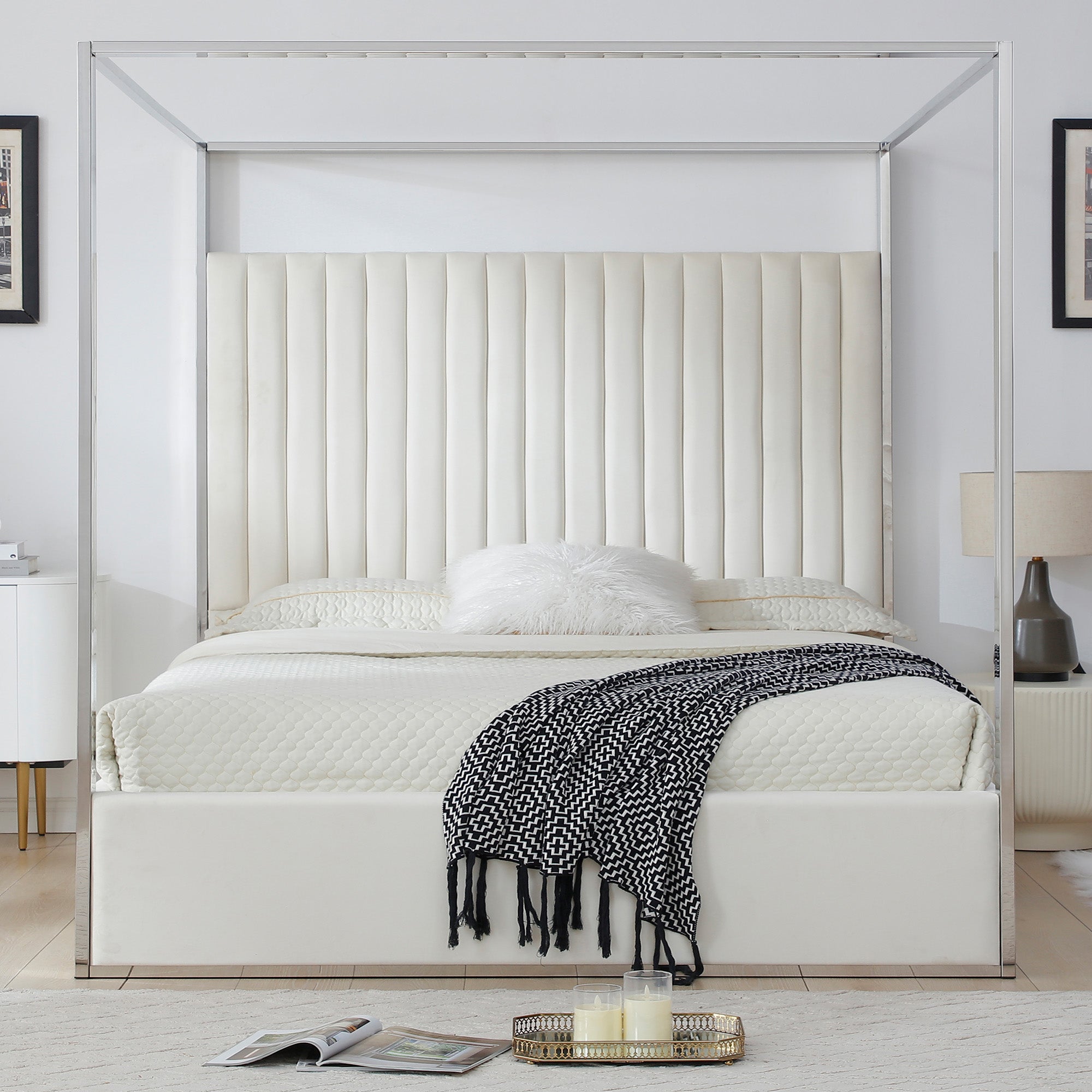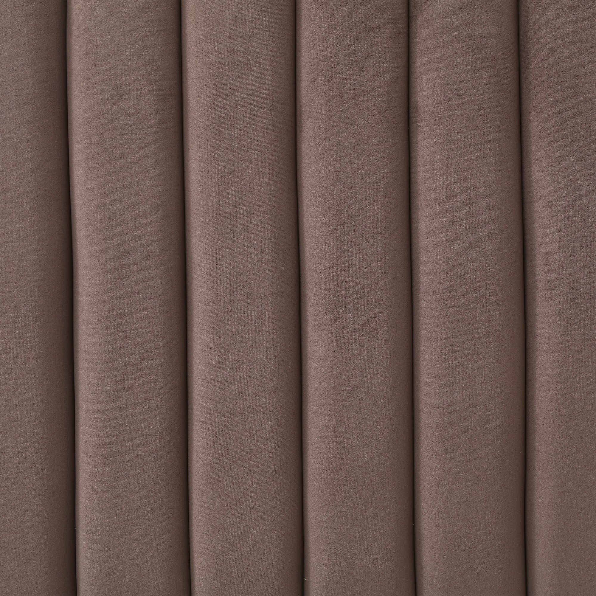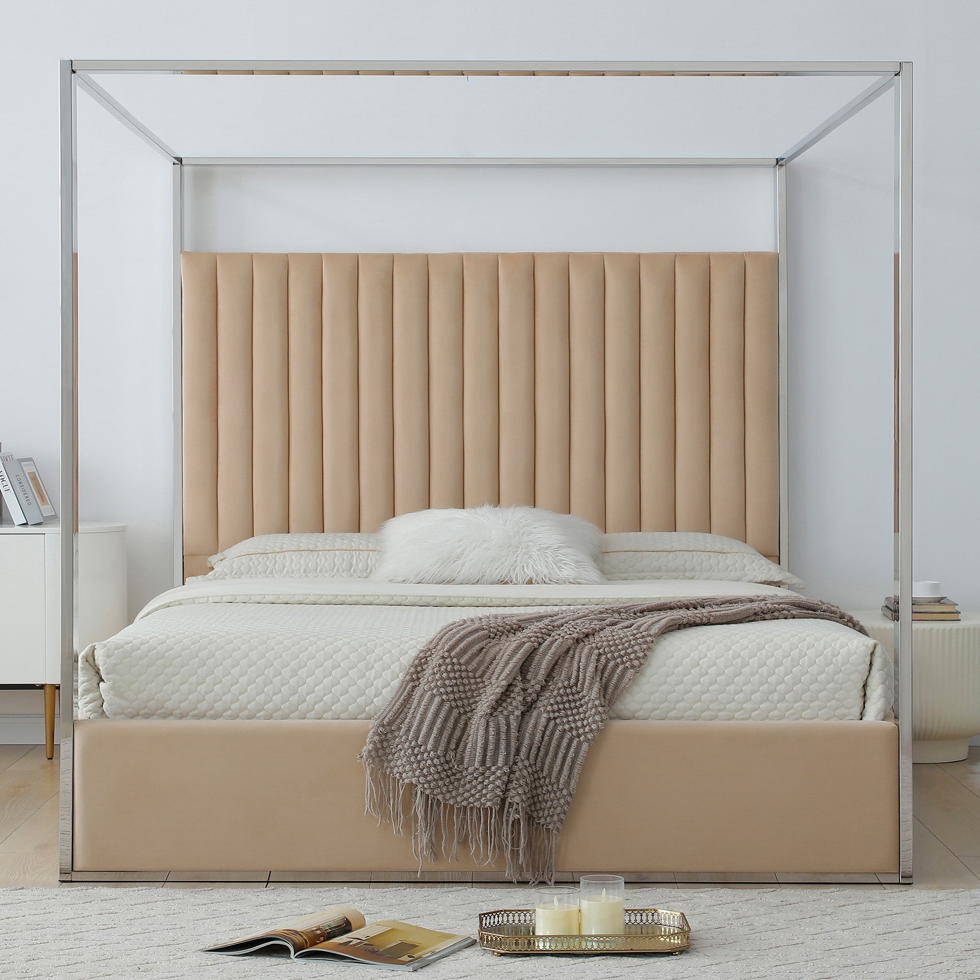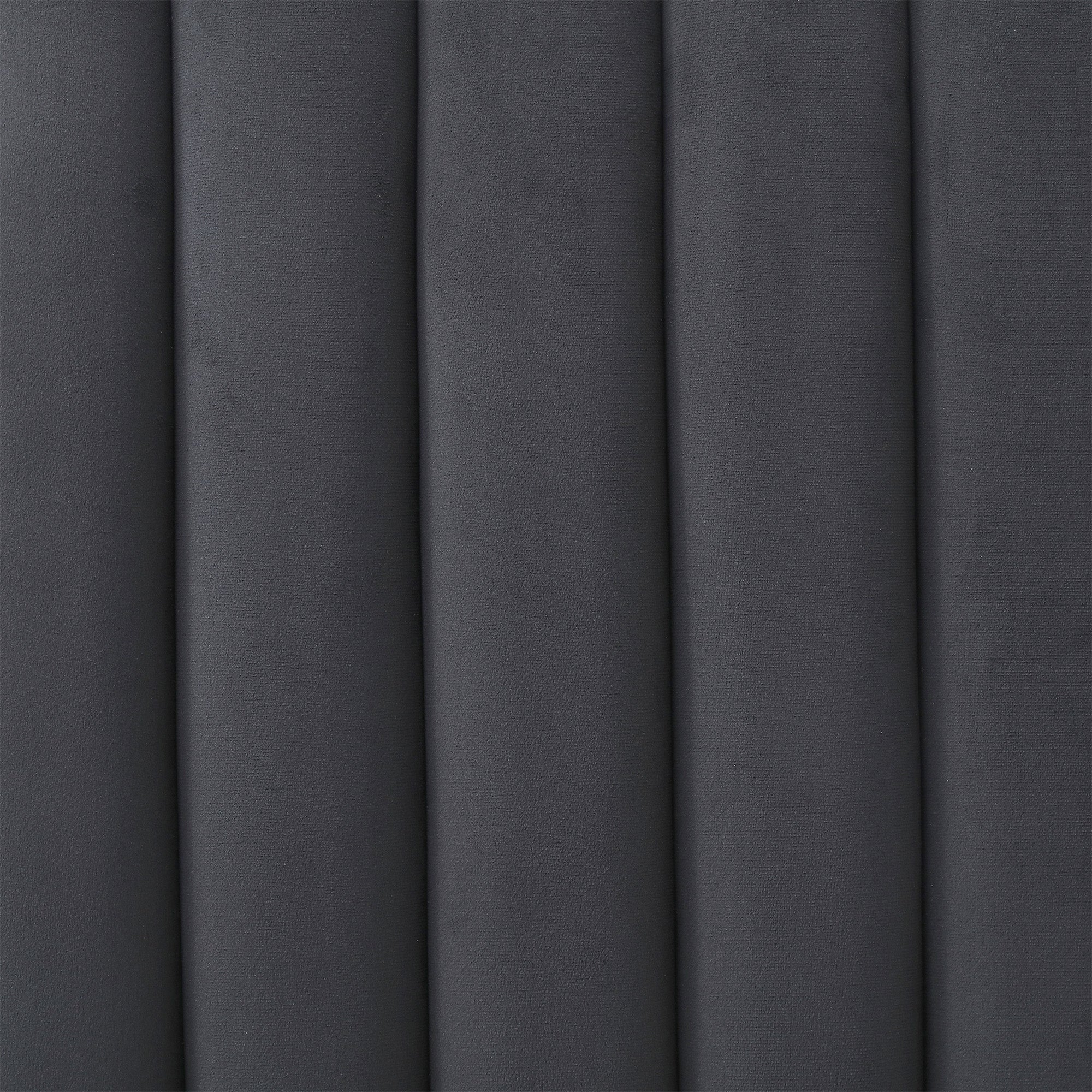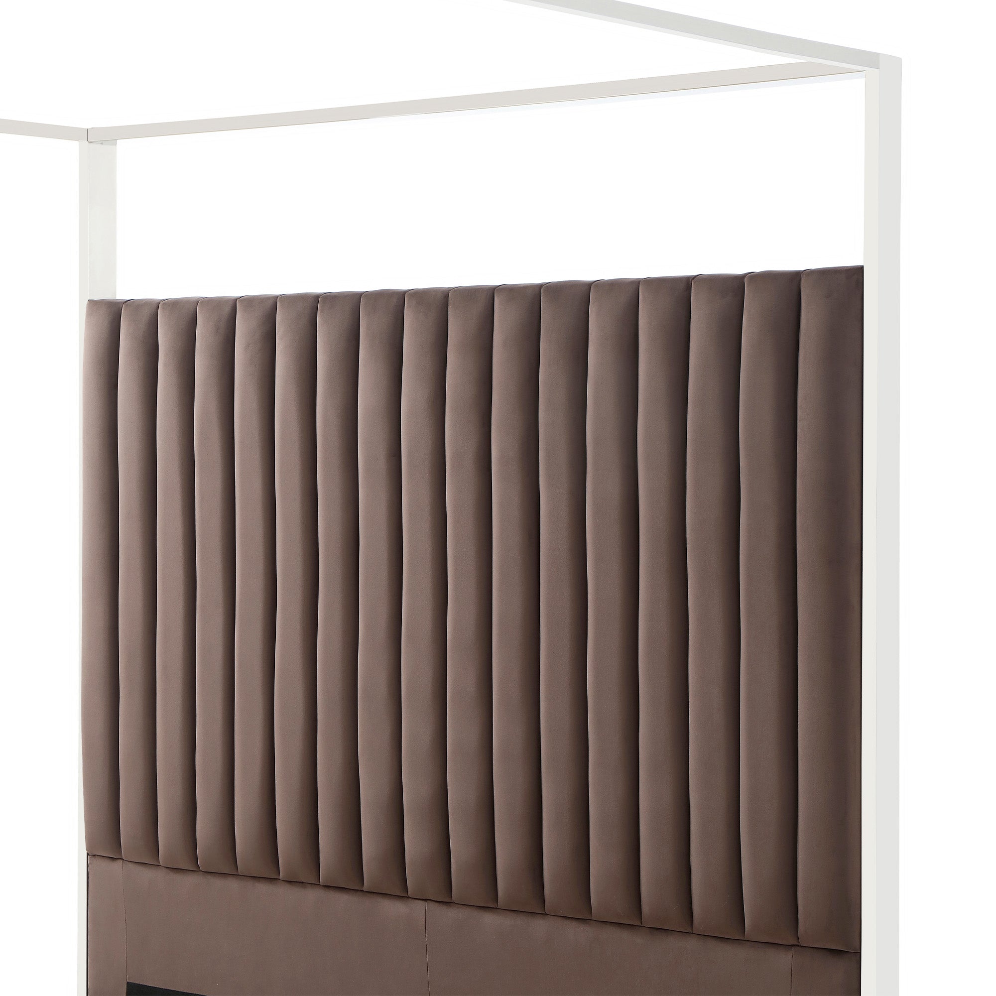 - Tall, velvet headboard with vertical tufting.