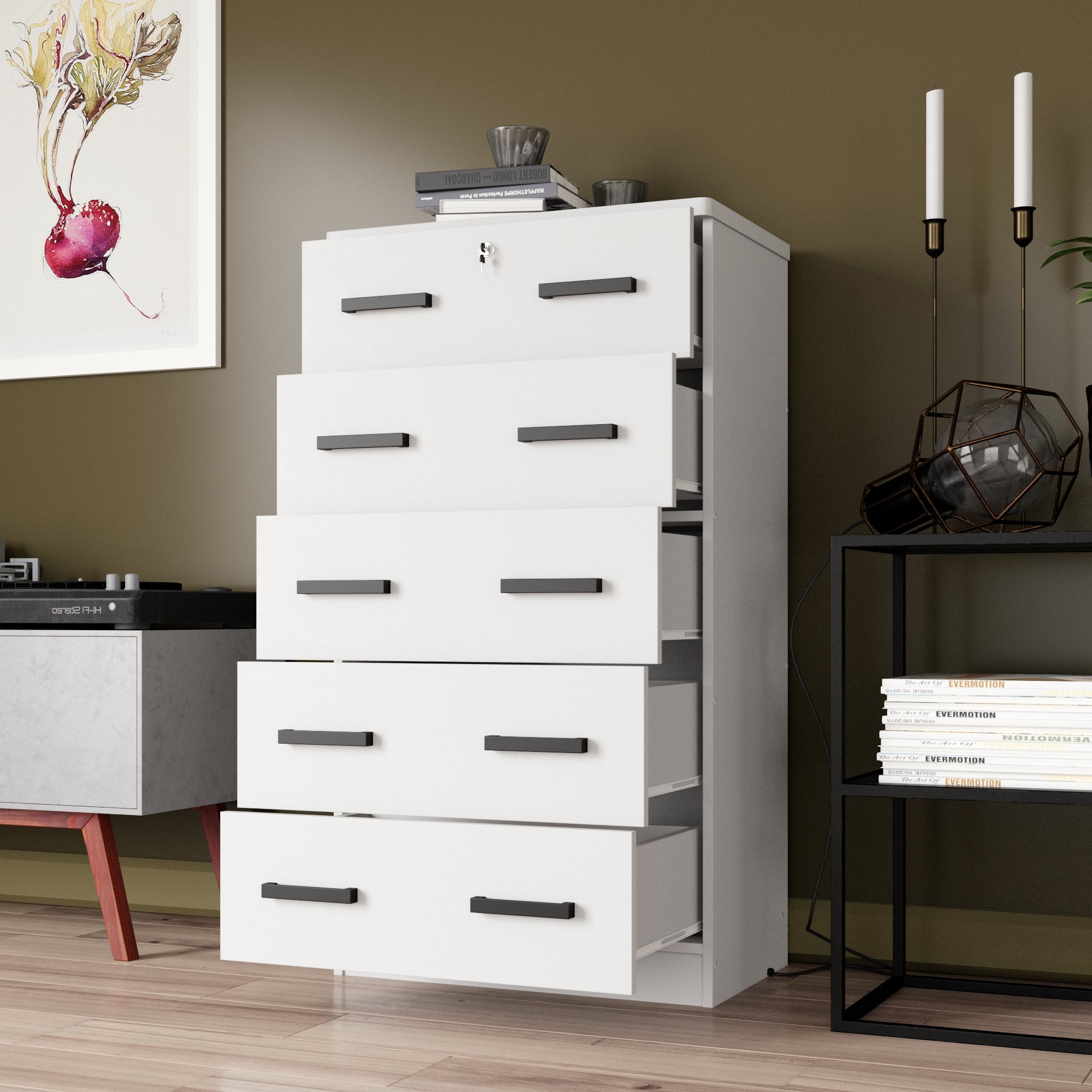 - Tall slim freestanding chest of drawers crafted from durable laminated engineered wood