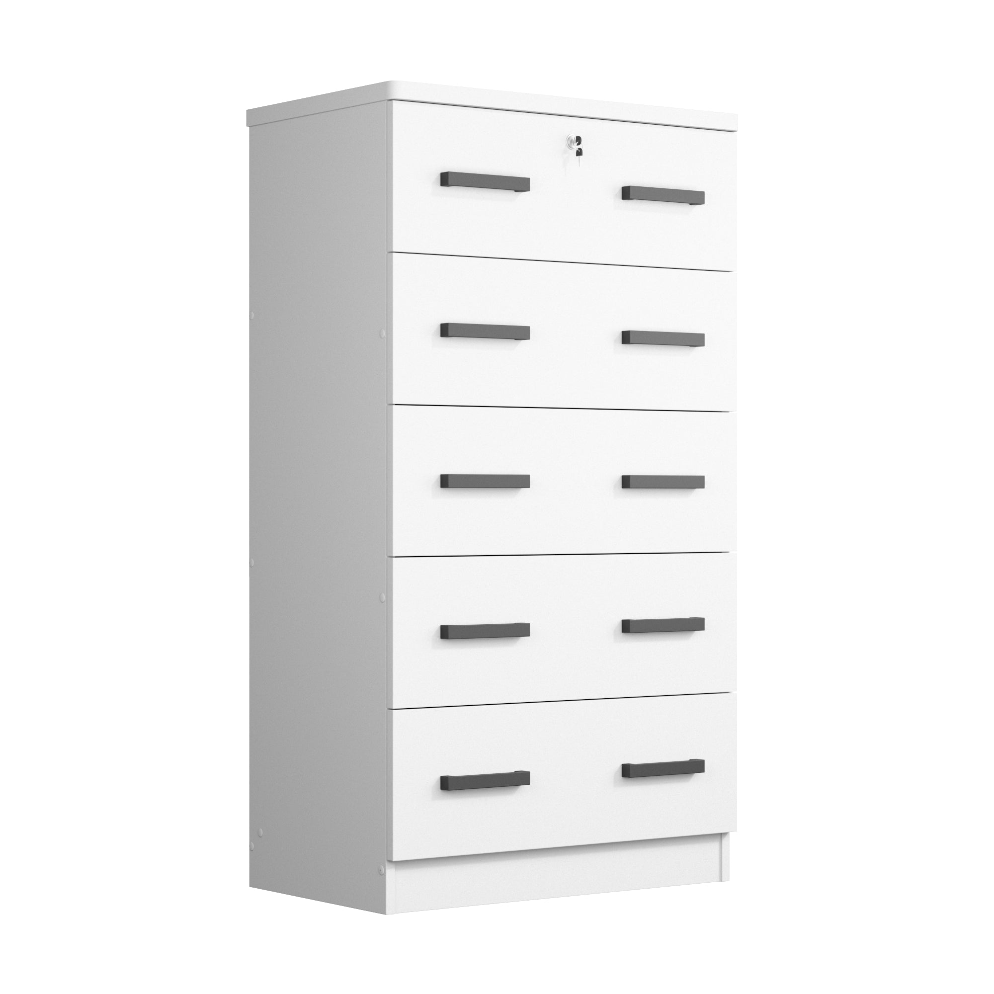 - The 5-drawer dresser features a modern design accented with silver plastic bar handles.